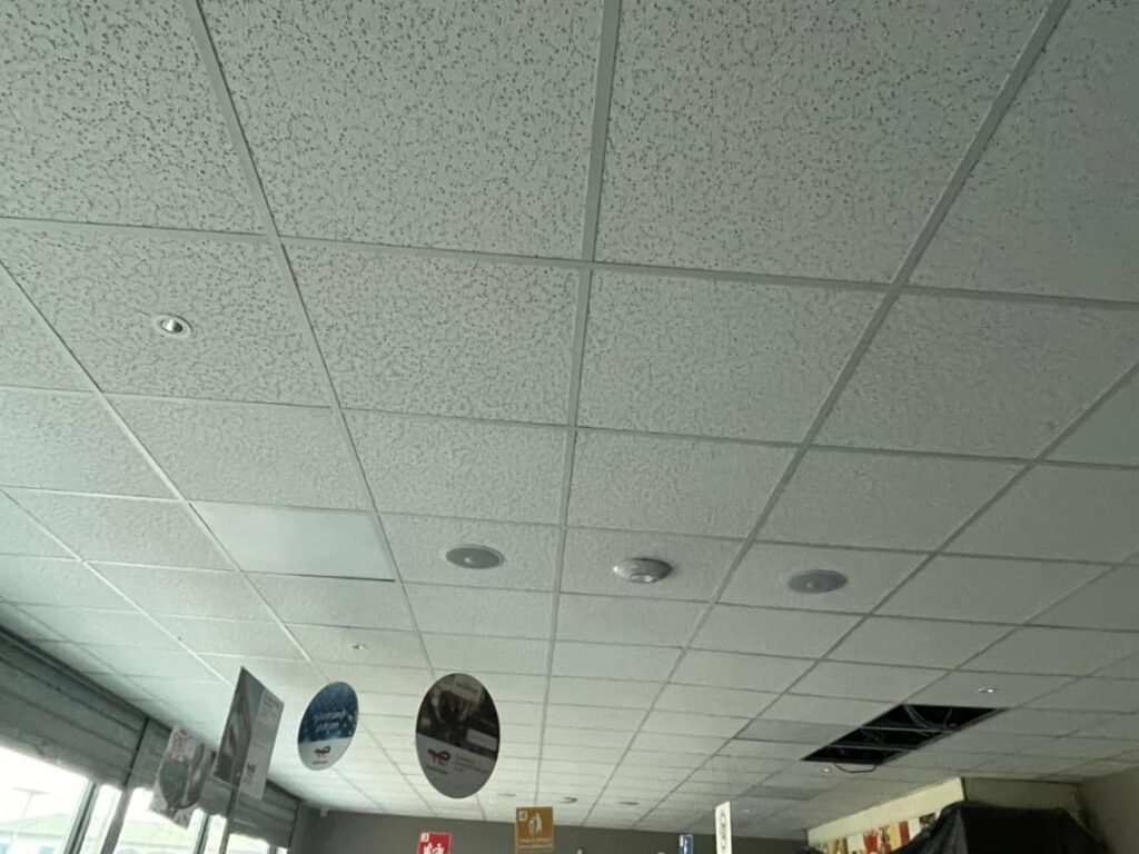 – Pose plafond intérieur boutique en panneaux acoustiques de 60cm x 60cm.